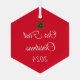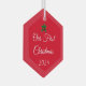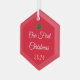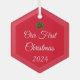Este adorno de vidrio Navidad se muestra en forma hexagonal con texto: Nuestra primera Navidad y fecha en un color blanco. El Personalizar rojo color de la parte trasera escarcha este artículo o compra tal como está.