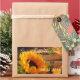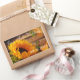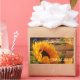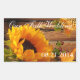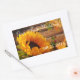 Un bello y tradicional diseño de campo con un tema de cosecha de otoño dorado que incluye un girasol, hojas de otoño y follaje, mariposa naranja y fondo rústico de madera. En maravillosos tonos dorados de otoño y otoño con naranja, verde y marrón.
