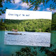 Dirección del lago moviendo postales con texto personalizado. Fotografía de niños jugando en una balsa flotante en un lago y colinas verdes a lo largo de la orilla, está al frente junto con el texto de su elección. También, texto personalizar en la parte posterior con nueva información de dirección. Perfecto para los afortunados que viven a orillas del lago.