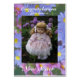 Felicitaciones tienes un nuevo texto de hermana sobre la tarjeta lila floral bordeada con muñeca de bonito con vestido de lila en la escena del jardín con fondo floral