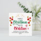 Elegante PRIMERA NAVIDAD COMO tarjeta de bienvenida CRISTIANA de nuevo creyente con TEXTO Y FECHA PERSONALIZABLE. El diseño muestra Navidades verdes y Navidades tipografía de escritura roja con baudias colgantes rojas y doradas y estrellas doradas en el centro. Una hermosa tarjeta de saludo para un nuevo creyente cristiano. Puede PERSONALIZAR EL TEXTO en la parte delantera y personalizar su mensaje en la parte posterior. Ideal como tarjeta de Navidades de la iglesia para los nuevos creyentes que celebran a sus primeros Navidades cristianos.