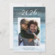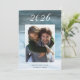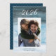 Elegantes tarjetas de fotos de Año Nuevo con tu foto favorita enmarcada por un fondo acuarela en azul océano rico. El año aparece en la parte superior en letras caligráficas, con el saludo de su personalizado y los nombres debajo.