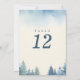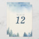 Esta tarjeta de número de tabla presenta un diseño minimalista pero elegante con un número grande y negrita centrado en la tarjeta. El fondo muestra un entorno tranquilo con un bosque de acuarelas, con árboles verdes en tonos suaves, azul y verde, que enmarcan el fondo y los lados. El sutil y maloliente cielo de la parte superior se suma a la tranquila estética, por lo que esta tarjeta es ideal para bodas y eventos al aire libre, de bosques o de temática rústica. Su diseño, limpio y moderno, asegura que el número de mesas se destaque y que se completa con un ambiente natural y sereno.