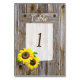 Tarjetas de número de mesa de madera desgastada y girasoles con estilo country y western para su recepción de boda.