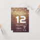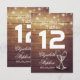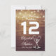 Plantillas de tarjeta de asiento / número de mesa / tarjeta de acompañante para boda - Letra elegante, gafas de champán vintage y luces de cuerda en fondo de madera rústica.