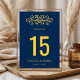 Número de mesa de boda con floritura dorada azul m