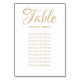 Número de mesa de boda con letra cursiva dorada falsa elegante y texto personalizado blanco, tarjeta de asignación de asientos para invitados.