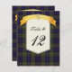 Tarjeta de número de mesa de boda con hermoso tartán escocés realizada con el colorido patrón de tartán del clan MacLellan en morado, negro, verde, rojo y amarillo. Un área de texto de color crema decorativa, en el medio tiene gráficos de una cinta de estilo de bandera de color amarillo dorado, en la parte superior. Gráficos de un Luckenbooth de tono dorado, símbolo del amor escocés, decora el medio de la cinta. El texto en negro es totalmente personalizable para adaptarse a las necesidades de su recepción. Productos de boda a juego disponibles. Personalice una para cada mesa en la recepción de su boda.
