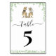 Tarjeta de número de mesa de boda de dinosaurio divertido con follaje de acuarela. Novios de dinosaurio T-Rex jurásico y elegante letra moderna.