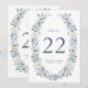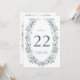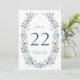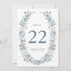 Número de mesa de boda floral azul. Entre en un jardín de belleza botánica y descubra un impresionante diseño de tarjeta de número de mesa de boda con hermosas flores de acuarela pintadas a mano dispuestas en una encantadora corona vintage. Las delicadas rosas azules polvorientas, crema y blancas y el follaje verde salvia del eucalipto crean una elegancia rústica, perfecta para su evento especial. La tipografía gris azulada y los toques sutiles de azul complementan perfectamente el diseño atemporal. Deje que esta exquisita invitación exprese su elegancia rústica romántica y su estilo atemporal.