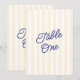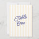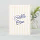 Una tarjeta de número de mesa de boda fresca y moderna que presenta rayas amarillas clásicas combinadas con un texto en azul. El fondo audaz a rayas crea un aspecto limpio y estructurado, mientras que la tipografía manuscrita añade un toque cálido y relajado.