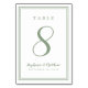 Una plantilla para cualquier número, este diseño de número de mesa de boda simple, minimalista y elegante presenta un diseño contemporáneo con un borde de doble marco en verde salvia sobre un fondo blanco crujiente. El diseño chic proporciona una sofisticación atemporal y moderna. Personalice el diseño de la mesa de boda con su nombre, fecha de boda y número de mesa en letras y escritura de moda en verde salvia. La parte trasera de la tarjeta es un duplicado de la parte delantera. Personalice fácilmente y ordene uno para cada mesa con los números de mesa individuales.
