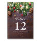 Tarjetas de número de mesa de fiesta de Navidad de invierno rústicas con un fondo de madera oscura, ramas de árbol de Navidad festivas, adornos de árbol rojos y dorados y luces centelleantes.