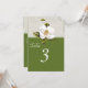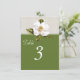 Tarjeta de número de mesa de recepción de boda encantadora hecha en verde, con un fondo de lino marfil y encaje en la parte superior. Un hermoso arte vintage de una flor de magnolia blanca adorna la parte superior de la tarjeta, en la parte delantera y trasera. El texto en blanco es totalmente personalizable y listo para personalizar para cada mesa en su recepción. Un bonito complemento a nuestro conjunto de boda Southern Magnolias.