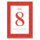 Esta elegante tarjeta de mesa de boda presenta un número "8" audaz de color coral centrado en un fondo blanco limpio, rodeado de patrones intrincados similares a hojas en un tono rojo a juego. El diseño combina el minimalismo moderno con una sutil sofisticación, utilizando líneas nítidas y colores sólidos para un aspecto pulido. La tipografía de letra cursiva delicada añade un toque elegante sobre el numeral, mientras que las fuentes sans-serif simples proporcionan claridad para los detalles personalizables a continuación. Perfecta para añadir un toque chic y contemporáneo a su recepción de boda, esta tarjeta está diseñada para crear una atmósfera de lujo discreto.