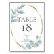 Tarjeta de número de mesa de boda | Hojas de eucalipto en acuarela en tonos de azul polvoriento con un marco ovalado dorado. Personalice el texto, el estilo de letra, el color y el tamaño. Arte original creado para BarefootBride™ por © WhimsicalArtwork™ - Esta es parte de un conjunto completo de papelería de boda con papelería de boda, baby shower y otros eventos.