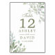 Número de mesa floral botánico acuarela rústica. Este diseño botánico simple y elegante presenta hojas de estilo acuarela de eucalipto en tonos de verde y blanco.