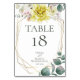Tarjeta de número de mesa de boda | Flores de peonía de acuarela amarilla con magnolias blancas de alabastro y vegetación - un marco geométrico dorado de múltiples facetas estilo terrario adornado con ramos florales. El reverso es de un color complementario coordinado. Personalice el texto, el estilo de letra, el color y el tamaño. Obra de arte original creada para BarefootBride™ por © WhimsicalArtwork™ - Esta es parte de una suite completa de papelería de boda con papelería de boda, baby shower y otros eventos coincidentes.