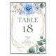 Tarjeta de número de mesa de boda | Flores de peonía de acuarela azul cielo claro con magnolias blancas de alabastro y vegetación - un marco geométrico dorado de múltiples facetas estilo terrario adornado con ramos de flores. El reverso es de un color complementario coordinado. Personalice el texto, el estilo de fuente, el color y el tamaño. Obra de arte original creada para BarefootBride™ por © WhimsicalArtwork™ - Esta es parte de un conjunto completo de papelería de boda con papelería de boda, baby shower y otros eventos coincidentes.