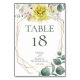 Tarjeta de número de mesa de boda | Flores de peonía de acuarela amarilla con magnolias blancas de alabastro y vegetación - un marco geométrico dorado de múltiples facetas estilo terrario adornado con ramos florales. El reverso es un color coordinado complementario. Personalice el texto, el estilo de fuente, el color y el tamaño. Obra de arte original creada para BarefootBride™ por © WhimsicalArtwork™ - Esta es parte de un conjunto completo de papelería de boda con papelería de boda, baby shower y otros eventos coincidentes.