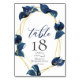 Tarjeta de número de mesa de boda | Moderno follaje frondoso azul añil profundo rodea un marco dorado multifacético: los destellos brillan en las hojas y un reverso azul añil profundo. Una combinación de caligrafía de letra script moderna con una disposición de texto minimalista y contemporánea la convierte en una suite de boda de estilo de moda. Diseño creado para TheBarefootBride™ por © WhimsicalArtwork™. Esta es parte de una colección de suites de papelería de boda con accesorios de boda a juego y también papelería para baby shower y otras ocasiones. No dude en contactarnos si necesita ayuda.