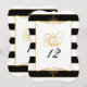 Si está buscando una solución elegante y económica para los números de mesa en la recepción de su boda, despedida de soltera u otro evento formal, estas tarjetas son un gran diseño. Puede personalizar tantas mesas como necesite, simplemente haga clic en el área del template, escriba el número de mesa (o nombre de la mesa) y colóquelo en su carrito de compras. Repita tantas veces como sea necesario. Un fondo moderno a rayas anchas en blanco y negro con un borde dorado delgado añadido se combina con un elemento de división de florituras dibujadas a mano enmarcado y una tipografía de caligrafía artística con la palabra "Mesa" con elegantes florituras en brillo dorado falso.