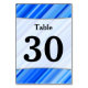 El diseño de esta tarjeta de mesa presenta un patrón de rayas o líneas de colores diversos en tonos azules. También cuenta con un número de tabla personalizado en negrita cerca del centro, dentro de un área de color más claro que tiene algunos bordes curvados. Estas tarjetas podrían utilizarse en las mesas de un fiesta de la recepción de bodas, una fiesta de vacaciones, una fiesta de cumpleaños grande, una conferencia o cualquier otro evento con mesas y sillas.