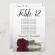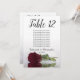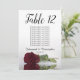 Estas hermosas tarjetas numerales facilitarán a los clientes la posibilidad de encontrar sus asientos en la recepción de su boda. Presentan un diseño sencillo pero elegante con letras caligráficas de guión y un solo rosa de color burdeos, marrón o rojo vitivinícola de tallo largo sobre su lado reflejando en el agua. La tarjeta incluye una tabla de asientos con 10 nombres. También hay espacio para los nombres de la pareja y la fecha de boda.