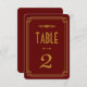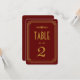 Estos números de mesa presentan una paleta de colores burdeos y dorado, un marco geométrico y otros detalles estilísticos inspirados en el Art Déco y los felices años veinte. Puedes personalizar los campos de texto de muestra a tu gusto.