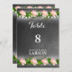 Unos números de mesa de boda en pizarra con hiedra, una cadena de luces y rosas rosadas. Los números de mesa de boda son parte de un conjunto completo.