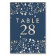 números de mesa de boda con aliento de bebé de lámina de oro azul marino