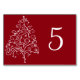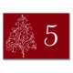 Personalice estos números de mesa de boda de invierno con árbol de Navidad rojo y cree una tarjeta diferente para cada mesa en su fiesta de compromiso de diciembre con clase, ducha de novia o recepción de matrimonio. Estas elegantes tarjetas de número de mesa personalizadas con tema invernal presentan un intrincado árbol de Navidad blanco con fondo rojo.