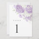 Número de mesa de acuarela de hortensias de color lila y blanco lavanda diseñado para una recepción de boda elegante y cohesionada. El arte floral suave combinado con un diseño clásico moderno y limpio crea un entorno de mesa refinado que se combina perfectamente con estilos de boda románticos, de jardín y elegantes. Ideal para planificadores que buscan un look de recepción pulido y bien coordinado.