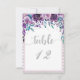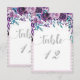 Números de mesa de boda florales y plateados púrpu