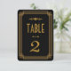 Estos números de mesa presentan una paleta de colores negro y dorado, un marco geométrico y otros detalles estilísticos inspirados en el Art Deco y los felices años veinte. Puede personalizar los campos de texto de muestra a su gusto.