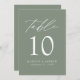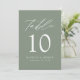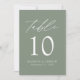 Tarjetas de números de tabla minimalistas y modernas con letras blancas modernas con "Table" en escritura moderna de caligrafía. El diseño tiene un fondo verde sabio o un color de su elección. El diseño se repite en la parte posterior. Para solicitar las tarjetas de tabla verde de sabios: agregue su nombre, fecha de boda y número de tabla. Agregue cada número a su carrito individualmente y desprotéjase cuando haya terminado.