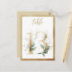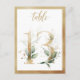 Hermosa tarjeta de número de mesa con un motivo botánico - una ilustración de acuarela de follaje verde y números con efecto dorado. Mesa 13. Por favor, revise todos los números disponibles