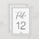 Hermoso en su simplicidad, las piezas de este conjunto de boda presentan acentos de escritura moderna y manuscrita, y una paleta de colores clásica en blanco y negro que se puede cambiar fácilmente para adaptarse a sus preferencias. Un borde geométrico sutil destaca esta tarjeta de número de mesa junto con las iniciales de la novia y el novio. Busque ID523 para ver todas las piezas de este elegante conjunto.