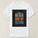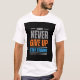 El diseño de la camiseta presenta un audaz mensaje motivacional puesto contra un fondo negro. El texto está organizado en un formato apilado y llamativo con cada frase en un color y estilo de fuente diferentes. En la parte superior, "ALWAYS" está escrito en letras blancas en mayúsculas y enmarcado por dos líneas blancas horizontales. Debajo, la frase "NUNCA RENUNCIAR" se destaca en grandes y angustiadas letras grises y naranjas, con "NUNCA" en gris y "RENUNCIARSE" en vibrante naranja. La última línea, "QUÉDATE FUERTE", está escrita en letras azules mayúsculas, también enmarcada por líneas horizontales blancas. La combinación de colores fuertes y contrastantes y tipos de letra angustiados transmite resiliencia y determinación.