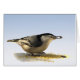 Esta tarjeta de nota muestra a Nuthatch, un adorable pequeño pájaro que sube y baja troncos de árboles como un picapapeles maderero en miniatura que busca insectos. Parece muy contento de haber encontrado la semilla perfecta! Es un pájaro calvo, con la cabeza grande, la cola corta, la mano poderosa y los pies fuertes. Las partes superiores son de color azul claro y gris, y la cara y la parte inferior son blancas. Él tiene una gorra negra. La nuthatch es una especie ruidosa con una amplia gama de vocalizaciones. Está situado en un gradiente azul pálido. Dentro hay otro pájaro pequeño más.