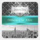 NY City Skyline BW B3 Damask F2 - Invitation Suite - Invitación al Personalizable Pegatina Invitaciones y accesorios con una icónica vista del horizonte de la ciudad de Nueva York desde la parte superior del Rockefeller Center 30, con una foto en blanco y negro del Empire State Building, el bajo Manhattan, incluido el World Trade Center. También tiene un patrón de damasco negro contra un fondo gris plateado degradado y una cinta turquesa. También cuenta con una etiqueta de gradiente blanco en un marco de aspecto plateado. Este producto forma parte de un conjunto de diseños de correspondencia que son de fácil personalizable para muchas ocasiones y eventos. Si necesita tarjetas RSVP separadas que coincidan, notas de agradecimiento, sellos, imanes u otros accesorios, por favor revise nuestros otros listados. Si no ves un producto que te interese, o te gustaría ver este diseño en diferentes colores o con diferentes fotos de NYCisMyMuse que ves en nuestra tienda, por favor contacta con nosotros y estaremos encantados de acomodarte. Tenga en cuenta que se trata de un diseño gráfico y que no contiene telas, metales ni estampados reales.