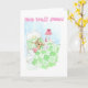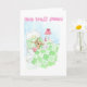 Una tarjeta de ‘Get Well Soon’ con un conejo en la cama, que se ve arrepentido por sí mismo con una botella de agua caliente, pañuelo descubierto y medicina junto a La cama. el interior se deja en blanco para tu propio mensaje.
