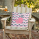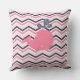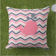 almohada al aire libre con rayas de chevron rosadas, blancas y azul marino con una bonita ballena rosa con marina y polka blanco salpicada de agua.