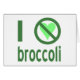Odio el brócoli. El diseño usa letras verdes, un corazón verde y el cartel internacional "NO" para leer "Odio el brócoli". Para los que no lo "caran", realmente no les gusta, pero tienen un sentido del humor (humor), les encanta reír y les hacen cosquillear su hueso gracioso.