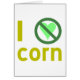 Odio el maíz. El diseño usa letras amarillas, un corazón verde y el cartel internacional "NO" para leer "Odio el maíz". Para aquellos que no lo "dan corazón".