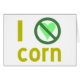 Odio el maíz. El diseño usa letras amarillas, un corazón verde y el cartel internacional "NO" para leer "Odio el maíz". Para aquellos que no lo "dan corazón".