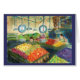 Dos vendedores de productos se apilan cuidadosamente y organizan las coloridas frutas y verduras en su puesto. Dos conjuntos de escalas cuelgan en armonía con las figuras. Se presenta en papel acrílico y pastel.