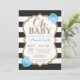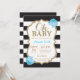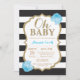 Oh Bebé Black and Gold Invitation de Baby Shower. Brillantina dorada. Chico Invitación de Baby Shower. Rayas blancas y negras. Flor Floral Azul. Para una mayor personalización, haga clic en el botón "Personalizar" y utilice nuestra herramienta de diseño para modificar esta plantilla.