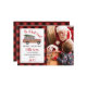 Ilustración de un camión rojo con paneles de madera que transporta un árbol de Navidad vivo. Texto personalizado. Personalice con su propia foto a la derecha. El borde y el lado opuesto tienen un patrón de cuadros de buffalo rojo y negro.