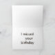 Diseñado como tarjeta de cumpleaños que se disculpa por faltar el cumpleaños del beneficiario.